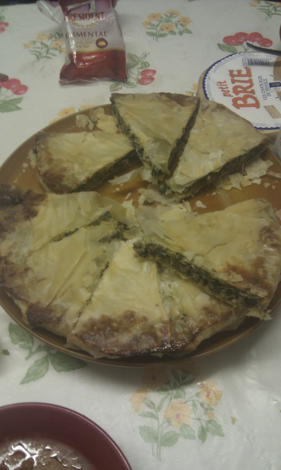 Brush a round tin with oil and inter-lay the rolls in a round motion leaving half of the pastry outside the tin until you cover the bottom of the tin (see picture!). Brush each sheet of the pastries with oil and add a second layer of oiled sheets, spread the stuffing in and fold all the extra pastry to cover the pie. Brush the surface again with oil and cook in a medium oven until golden brown. Enjoy the summary dream before it snows again!